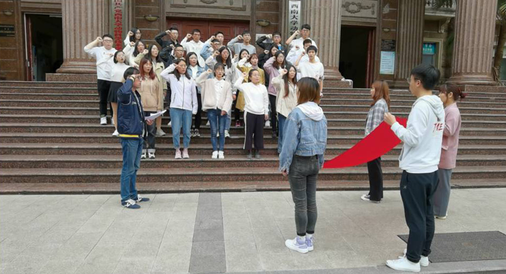 第一环节由支部书记章杰老师带领全体党员重温入党誓词。党员佩戴党徽,列队整齐,面对鲜红的党旗,庄严的举起右手,重温入党誓词。入党誓词虽然只有八十个字,但是字字如千金,重温入党誓词是激励、鞭策,更是对信仰的强化。重温入党誓词,要求我们恪守承诺、与时俱进、继续努力,做到一时的誓言,一生的承诺、一辈子的坚守。为弘扬革命先辈不畏艰难险阻、勇于献身的革命精神,激励广大党员坚定理想信念,不忘初心、牢记使命,全体党员和入党积极分子们,手持五星红旗,自觉排成“100”字样队列,庆祝中国共产党成立100周年。
