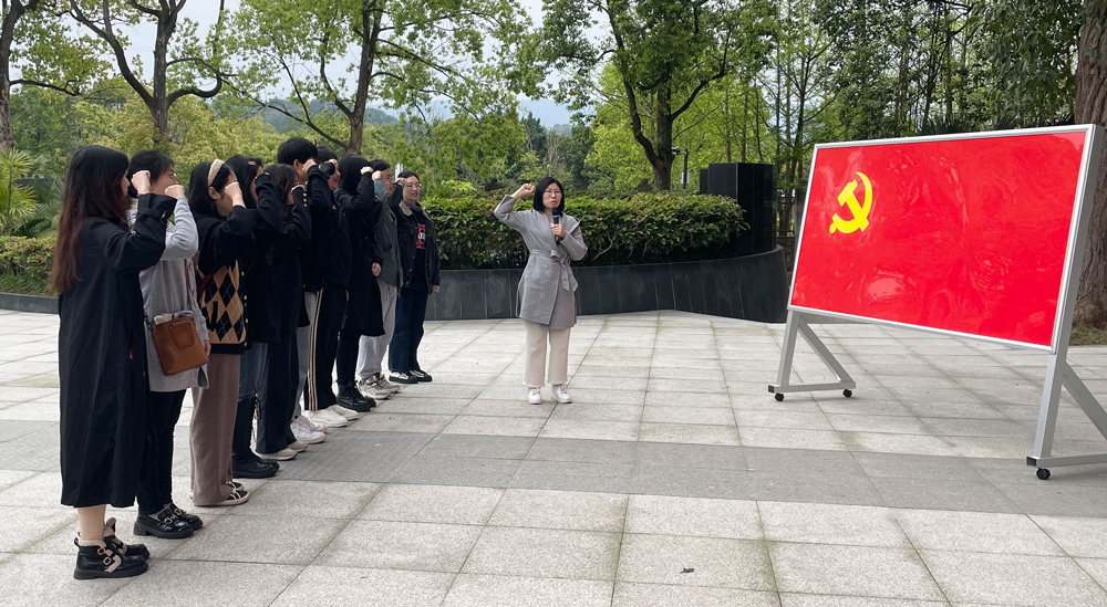 支部党员怀着崇敬的心情来到王朴烈士陵园,在烈士陵墓前集体敬献鲜花、敬礼鞠躬,并绕烈士陵墓慢走一圈,表达哀思。随后在王朴烈士纪念馆参观学习烈士的英勇革命事迹。王朴与母亲金永华同志用他们全部的家产和生命,展现了共产党人忠于党、忠于人民的高尚情怀,谱写了令山河动容、以身殉志的忠党爱国英雄革命赞歌。他们出生富豪之家,以崇高的献身精神为人民大众利益服务,以坚定的信仰对共产主义事业赤胆忠心,毁家纾难助党,革命浩气长存,感动了在场的每一个人。参观结束后,支部书记范成莉老师带领党员重温入党誓词,表达了青年学子对党绝对忠诚、为共产主义事业奋斗终身的决心。