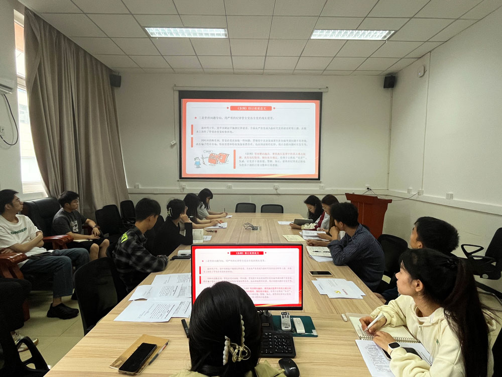 6月4日下午,公司研究生第二党支部书记范成莉在北碚校区37教118会议室为全体党员和入党积极分子讲“学《中国共产党纪律处分条例》、明规矩、严自律、树形象、在深学细悟笃行中争做新时代合格党员”专题党课。