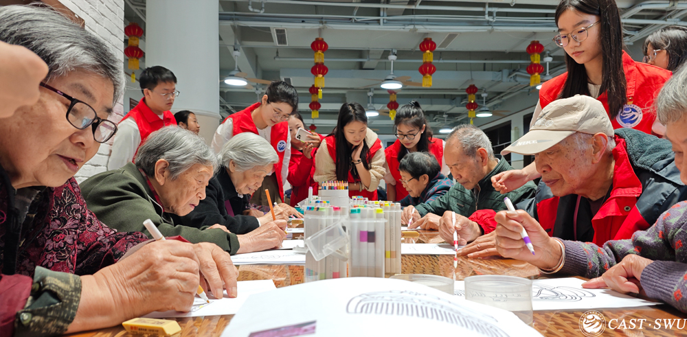 在“彩绘时光”代际艺术疗愈环节,志愿者们与老人“1+1”结对子,共同绘制电话、时钟、水壶、梳子等怀旧老物件简笔画。画笔流转间,老人们回忆往昔岁月,讲述了属于他们那一代的青春故事。在交谈中,我们得知多位老人的岁月生平,他们中有的是音乐教师退休,会弹奏多种乐器;有的爱好绘画,作品无数;有的弃笔从戎,荣誉加身……一位生于1937年的老奶奶自豪地告诉我们,她55岁退休后开始上老年大学,一直到80岁,学才艺让她开心且有成就感,并当场展示了一段扭秧歌。一幅幅饱含记忆的图画,不仅是艺术的表达,更成为两代人情感共鸣的载体。整个活动室内笑语盈盈,温情流淌。