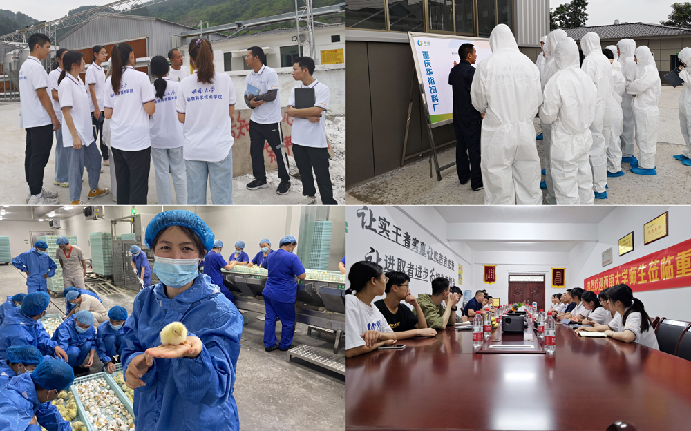 河北华裕集团是一家深耕蛋鸡产业的大型农牧集团。2018年,河北华裕集团与重庆丰都县共同签署蛋种鸡产业精准扶贫项目,助力重庆精准扶贫和乡村振兴。小分队成员参观了河北华裕集团丰都公司种鸡场、饲料厂和孵化中心,了解和体验了机械化、自动化、智能化设备在蛋鸡生产上的广泛应用。种鸡场内,饲养生产线上的料线、水线、集蛋、除粪等设备,养殖车间内温度湿度调控、空气过滤、排风除尘、异味消杀等环节,处处体现着机械化、自动化、智能化和科技化。饲料厂内,从原料进料仓,到成品出厂门,各环节都采用智能化的现代生产设备,年产几十万吨的饲料厂,只需8名员工即可。孵化中心内,同学们体验了从选蛋、孵化、雌雄鉴别、断喙、疫苗注射、鸡苗运输等各个生产环节,收获满满。