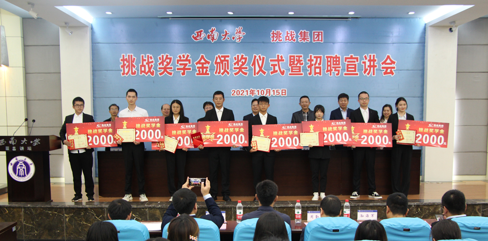 10月15日, 2020-2021年度挑战奖学金颁奖仪式暨招聘宣讲会在荣昌校区2211报告厅隆重举行。挑战集团创始人蔡辉益、大客户事业部总经理刘家、人力资源招聘培养项目总监李小君等出席,Mksport体育app官网入口荣昌校区党工委副书记、纪工委书记魏培修,公司党委书记赵智华,党委副书记、纪委书记文武,副经理周克勇等应邀参加。仪式由文武主持,在荣各公司员工代表二百余人参加。