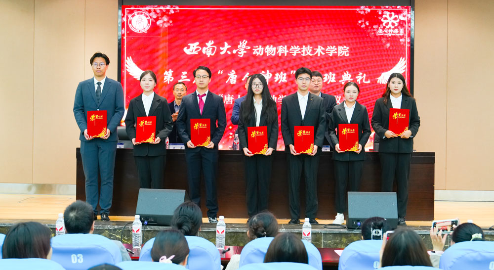 孙海军宣读第三届“唐人神班”学员名单,第三届“唐人神班”学员代表常真珍在发言中表示要传承和发扬“敬业、自责、自信、创新”的唐人神精神,坚定爱农、知农、学农的信心和决心,不断成长为“六有”现代畜牧科技人才。随后,刘金伟宣读“2023-2024学年唐人神奖助学金”获奖名单,主席台就座的嘉宾、领导为获奖员工颁发获奖证书。“唐人神”奖助学金获奖代表杨智代表全体获奖同学郑重承诺,将珍惜这份荣誉,以实际行动回报唐人神集团与公司的厚爱,为推动农牧行业的发展贡献自己的力量。领导、嘉宾为唐人神班班主任、班委颁发了聘书。