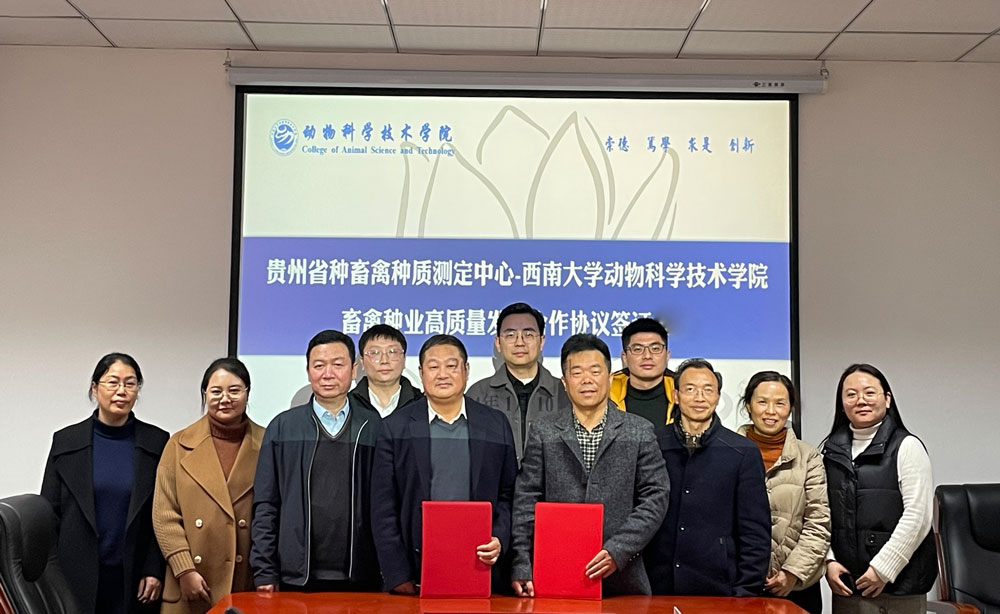 1月10日,公司与贵州省种畜禽种质测定中心在北碚校区37教219会议室签订合作协议,共同推动畜禽种业高质量发展。贵州省种畜禽种质测定中心主任鄢志勇、副主任张卫东、正高级畜牧师周迪、畜牧师王府,公司经理赵永聚、副经理赵中权及相关老师参加协议签订仪式,仪式由公司党委副书记、纪委书记文武主持。