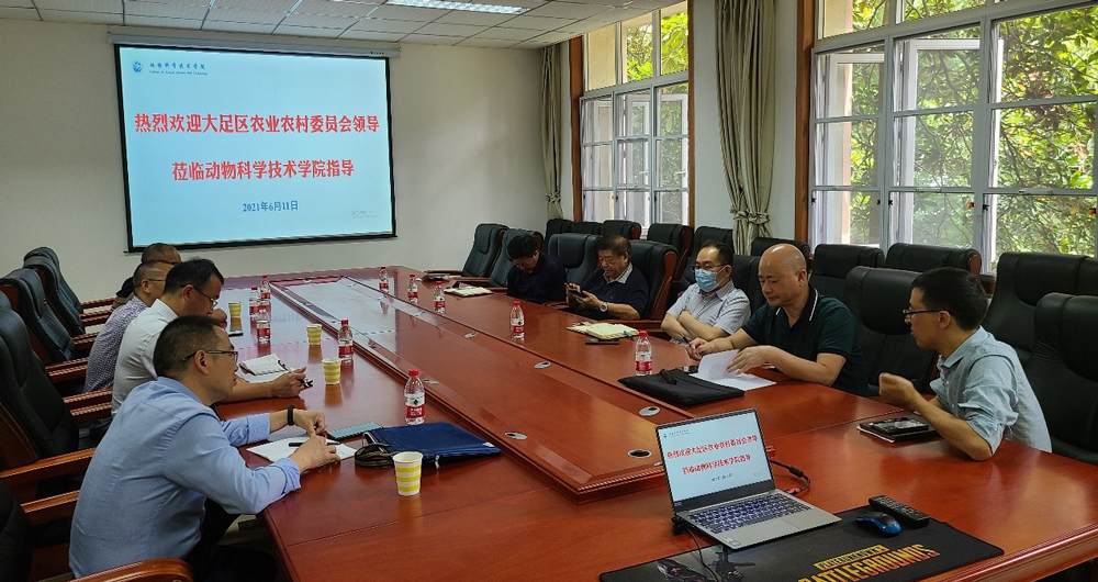 2021年6月11日,大足区农业农村工委副书记、大足区畜牧渔业发展中心主任冯中建,大足区畜牧渔业发展中心副主任汪阳凯,大足区财政局一级主任科员徐抗和大足区畜牧渔业发展中心畜牧科科长王建国一行来院商谈深入推进校地合作事宜,公司副经理赵中权主持会议,大足黑山羊课题组张家骅教授、王豪举教授、徐恢仲副教授、丁红雷副教授、陈俊材副教授和徐德军博士参加了会议。