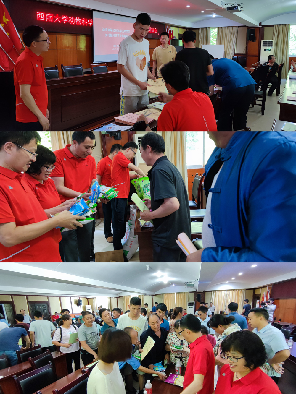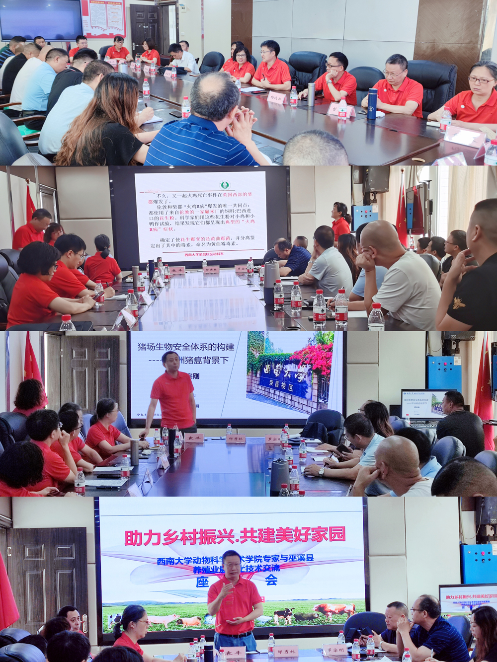 照方案的安排,7月11日—15日,公司党委书记赵智华带领由党员专家团队等组成的15名教职工暑期志愿者“三下乡”服务队先后赴重庆市巫溪县和城口县修齐镇、咸宜镇李坪村开展“三下乡”活动。活动期间,服务队先后到巫溪县陆旺养殖有限公司和重庆腾展家禽有限公司进行实地走访,了解企业生产经营中遇到的困难和问题并进行现场指导,并先后听取了重庆市巫溪县农业农村委和城口县修齐镇、咸宜镇李坪村相关领导、养殖企业(户)的科技需求及乡村振兴中遇到的问题困难。针对大家提出的问题,服务队老师们以专题授课的形式做了养殖技术、营养与饲料、疾病防控等方面的培训,并通过现场答疑解惑的方式解决了许多困扰当地养殖企业的技术难题,与养殖企业(户)建立了线上联系机制,以便他们遇到困难时能够及时得到帮助。服务队还为养殖企业(户)现场免费发放了200余份《助力乡村振兴科技下乡养殖技术资料》和3000余元由重庆大农科技集团有限公司、重庆西农大科信动物药业有限公司、同连生物科技集团和重庆新动生物技术有限公司等企业赞助的乳猪用奶宝60份、乳猪抗痢产品40份、牛羊肥40份、益生菌添加剂100包,并为他们详细讲解了这些畜禽养殖用品及常用药品的使用方法。