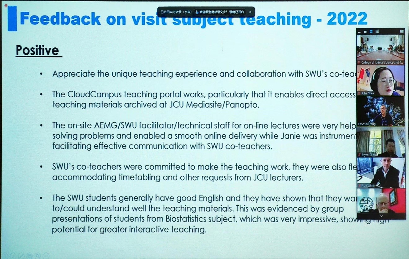 6月18日,公司与澳大利亚詹姆斯·库克大学(James Cook University,JCU)及澳大利亚教育管理集团(AEMG)顺利召开2021 – 2022学期动物科学中外合作办学学术指导委员会(Academic Advisory Board,简称AAB)视频会议。JCU理学与工程公司经理Ron White教授,公共卫生与兽医公司经理Ted Whittem教授,国际处处长Clare Magee女士,国际关系处主任Janie Edwards女士等专家教授出席会议;Mksport体育副经理赵中权,公司中外合作办公室副主任杨游副教授、秘书孙雅望博士,共课教师代表唐自如教授、韩玉竹副教授等教师,以及AEMG的Bruce Calway教授等相关工作人员共同参加。