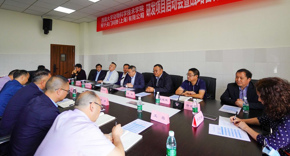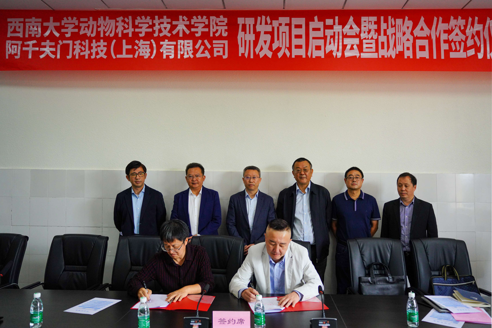10月20日,公司与阿千夫门科技(上海)有限公司(以下简称“阿千科技”)战略合作签约仪式在荣昌校区第二教学楼举行。荣昌区副区长程昌耀、重庆市畜牧科公司经理刘作华、重庆市农业农村委员会总畜牧兽医师汤明、对外合作处处长王涯军、畜牧处一级调研员许会军、荣昌区科技局局长赵敏、荣昌区农业农村委副主任张义君、招商办主任陈光虎、畜牧中心主任林丹、阿千科技董事长胡中一、董事廖勇、施戎、吴任斌等参加仪式,仪式由赵中权副经理主持。