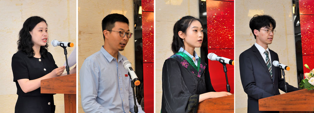 员工代表刘博洋在发言中表达了对母校和老师的感恩之情,向即将毕业的同学们致以最热烈的祝贺,希望大家能勇敢地追求自己的梦想,始终保持学习的热情,突破自我,向上生长,成为更好的自己,不断为社会做出贡献,为母校争光。