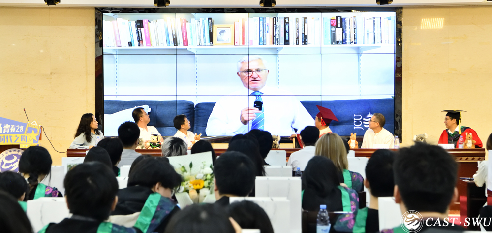 远在澳大利亚的詹姆斯∙库克大学副董事长Marcus Lane作视频寄语,表达了对毕业生的美好祝福,希望两校能继续深入合作、共促发展。