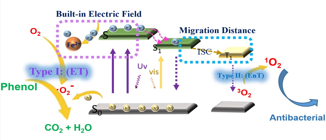 合理设计方案并充分利用太阳能有利于最大限度地发挥光催化材料在环境净化和绿色养殖应用中的潜力。公司动物种质创制与智能畜牧团队苗宏博士与清华大学朱永法教授合作通过微波法制备具有二维结构的酞菁铁有机聚合物(Ex-PcOP-Fe)纳米片(图1),进一步研究发现,Ex-PcOP-Fe中的Fe作为催化活性中心及电子捕获中心,可以提供强大的内置电场,促进了光生载流子的快速分离和迁移(图2)。