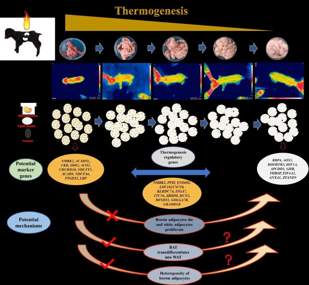 本研究系统分析了山羊出生后0 d、7 d、14 d、21 d和28 d肾周脂肪的组织学、细胞学和相关分子水平变化。首先,利用红外热成像系统研究了出生后0~28 d山羊羔羊的产热变化,发现肾周BAT对新生山羊的体温调节至关重要;其次,观察到肾周脂肪在羔羊出生后出现了急剧的棕色到白色样脂肪组织的变化过程,其特征是棕色脂肪组织颜色变白、脂滴变大,甘油三酯含量上升,线粒体数量下降,线粒体呼吸链复合物(I-III)下调及关键性产热相关基因(UCP1、DIO2、UCP2、CIDEA、PPARGC1a等)表达下调;还发现脂肪组织的标记基因具有物种间差异,并对山羊脂肪组织的潜在标记基因进行了定义;最后,羔羊棕色到白色样脂肪组织的变化过程不涉及棕色脂肪细胞的大规模死亡和白色脂肪细胞的增殖,但需要进一步的研究来阐明棕色到白色样脂肪组织的这种变化是由于成熟脂肪细胞的转分化,或是由于高、低产热脂肪细胞亚群共存导致。