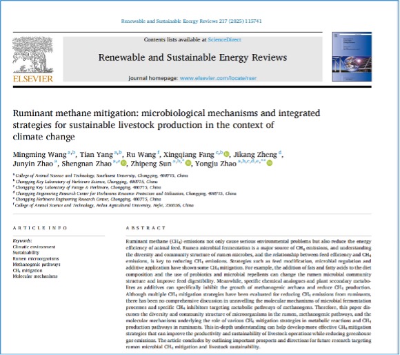 2025年4月11日,Mksport体育赵永聚教授研究团队在国际顶级TOP期刊 《可再生与可持续能源评论》(Renewable and Sustainable Energy Reviews)正式发表了题为《反刍动物甲烷减排:气候变化背景下可持续畜牧业生产的微生物机制和综合战略》(Ruminant methane mitigation: microbiological mechanisms and integrated strategies for sustainable livestock production in the context of climate change)的论文,系统梳理了反刍动物甲烷减排的微生物学机制及综合调控策略,为草食畜牧业低碳转型绿色发展提供科学依据。